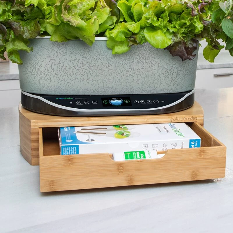 Elevate your countertop AeroGarden with this convenient bamboo storage drawer for plant food, extra seed pods, and more.