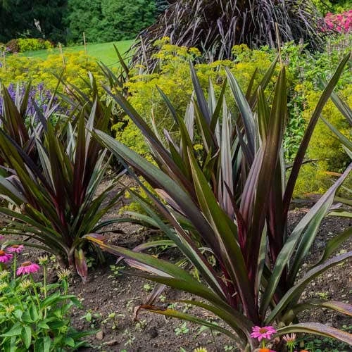 APPEARANCE: Compact fountain-shaped strappy-leaved plant with long slender maroon-purple leaves. Smooth stems topped with pink lily flowers August – January and at its peak in early summer.